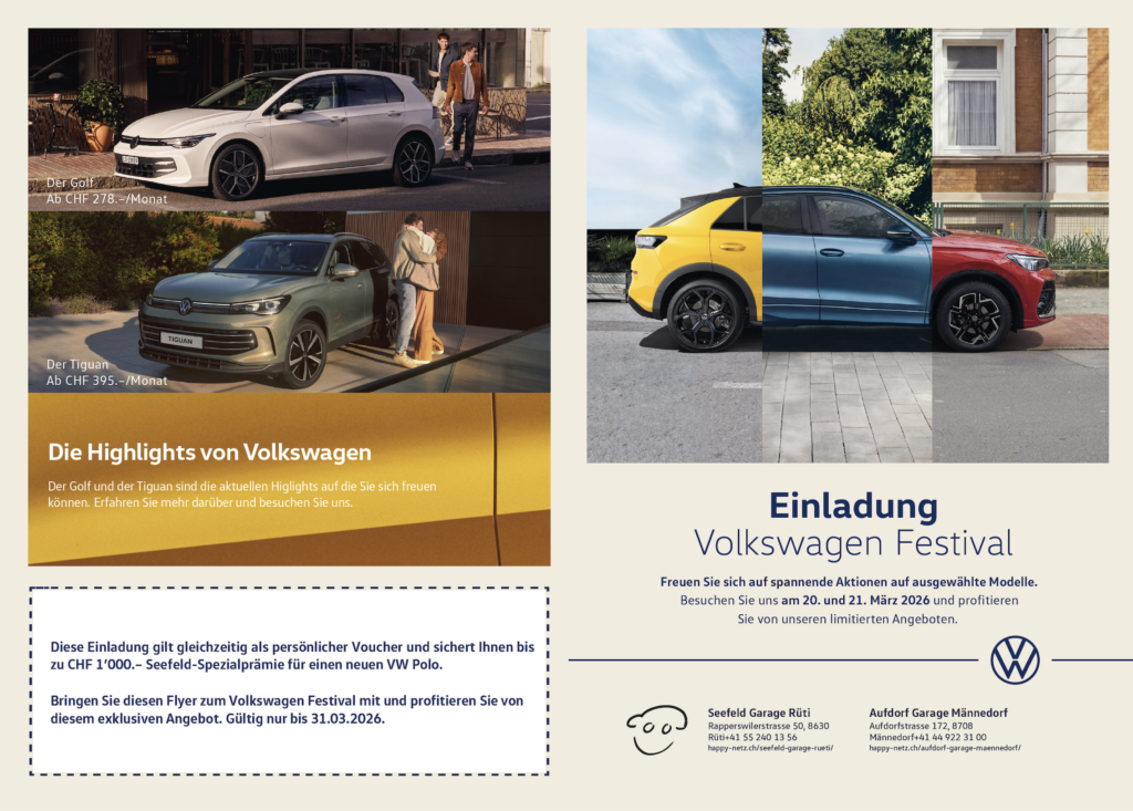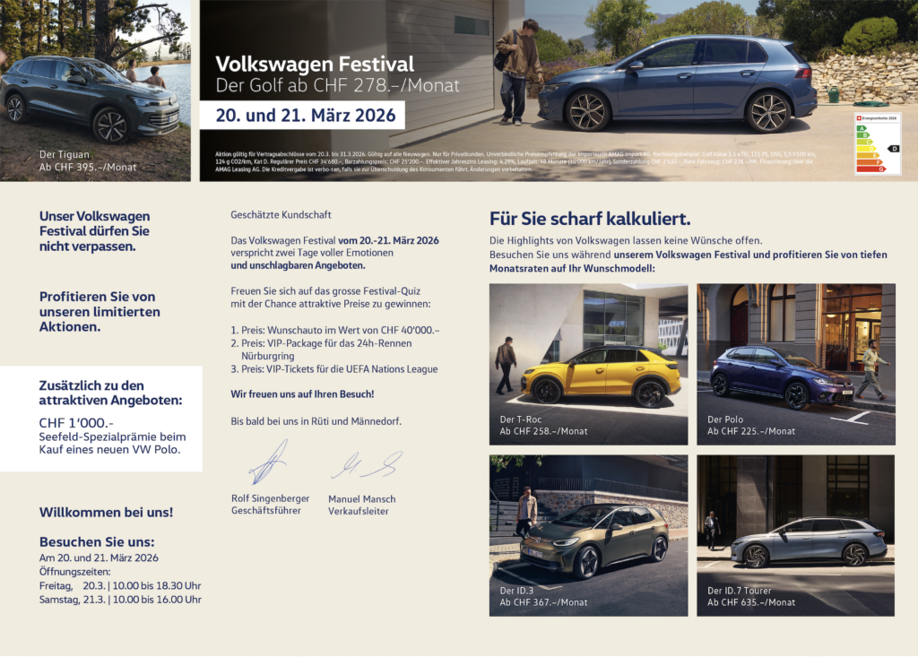 2.Aktion gültig für Vertragsabschlüsse vom 20.03.2026 bis 31.03.2026. Gültig auf alle Neuwagen. Nur für Privatkunden. Unverbindliche Preisempfehlung. Rechnungsbeispiel: Golf Value 1.5 eTSI, 115 PS, DSG, 5,5 I/100 km, 124 g CO2/km, Kat D. Regulärer Preis CHF 34’680.-, Barzahlungspreis: CHF 25’200.-. Effektiver Jahreszins Leasing: 4.29%, Laufzeit: 48 Monate (10’000 km/Jahr), Sonderzahlung CHF 2’650.-, Rate Fahrzeug: CHF 278.-/Mt. Finanzierung über die
