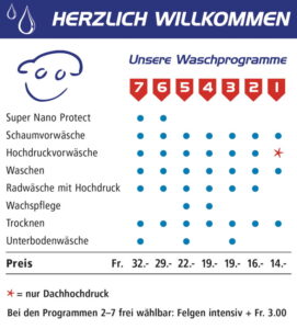 In unserer Waschanlage stehen Ihnen acht individuell wählbare Waschprogramme zur Verfügung – bereits ab CHF 13.– bis maximal CHF 30.– reinigen Sie Ihr Fahrzeug perfekt und gründlich